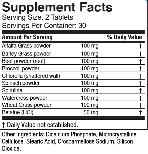 Multi-Veggies, with betaine HCL, contains nine natural green foods providing vital nutrients.