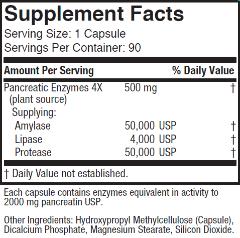 Pancreatic Enzymes 4x - Vegetarian, 500mg, 90 Vegetarian Capsules